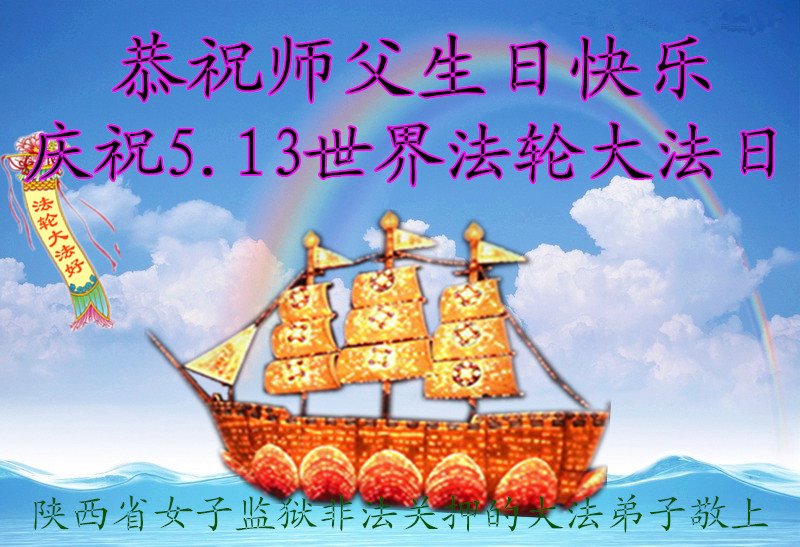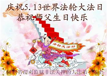 恭祝师父生日快乐! 庆祝5.13世界法轮大法日! 陕西省女子监狱非法关押的大法弟子敬上 辽宁省营口地区被非法关押大法弟子恭祝世界法轮大法日!暨师尊华诞