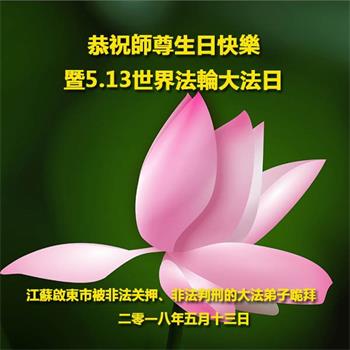 | 【明慧网二零一八年五月十二日】(明慧网通讯员大陆综合报道)自一九九二年,在中国大陆失去信仰的年代,涌起一股清流,人传人、心传心,有缘百姓找到了法轮大法,真、善、忍信仰使人心归正,重德行善,身心愉悦。 就这样对社会有百利而无一害的功法,遭到中共江氏集团十九年的打压——冤狱、酷刑、洗脑……然而,法轮功学员们如冰霜下的梅花依然绽放,更纯清、更坚定、更艳丽。 在法轮大法师父李洪志先生六十七岁华诞之际,这些被非法关押的法轮功学员以各种方式向尊敬的师父发来贺词,并同祝世界法轮大法日! 天津市东丽区一老年大法弟子说:“我是天津市一老年大法弟子,被非法关押在看守所迫害一年……不忘自己是大法弟子,在任何环境下都承担着证实法、讲真相救度众生的使命。同时还要学好法,修好自己,保持每天两小时的炼功时间;开创了证实法、学法、炼功、讲真相救度众生的宽松环境。这三百六十五天都是在师父的引领、保护下平稳的走过来的。” 湖北省天门市被非法关押的大法弟子说:“现身陷囹圄,但无论在哪里,我都做着大法弟子的事,每天背法、炼功、发正念从不间断,每个進监同室的人我都向她们讲大法的真相,绝大部份都做了‘三:退.’。” 被非法关押在佳木斯监狱的黑龙江大法弟子赋诗感恩师尊: 五月十三大法传 万里春风荡浩然 春雷滚滚神光启 撗扫残云阴霾散 幽幽梅香春潮涌 洪恩浩瀚撰书怀 无量众生真觉醒 法船悠悠天际来 吉林省榆树市被非法关押大法弟子恭祝师生尊生日快乐!暨世界大法日!