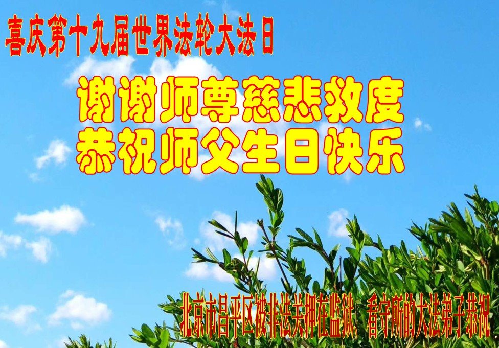值此世界法轮大法日来临之际,北京石景山区一家四口及北京地区被非法关押的大法弟子向师尊问好,恭祝师尊生日快乐! 狂飙十九载 初心志不改 巨难不回头 随师把家还 北京市昌平区被非法关押在监狱、看守所的大法弟子感谢师父慈悲救度!恭祝师父生日快乐!