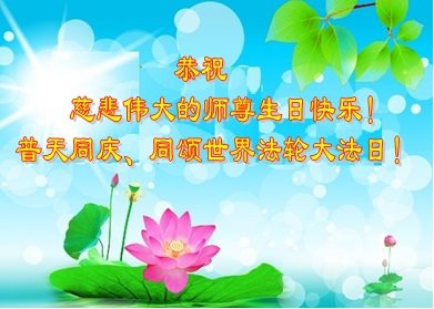 恭贺世界法轮大法日! 我们感恩师尊,没有师尊的慈悲保护、点化,就没有我们的今天。世人受无神论毒害。殊不知,没有师尊洪大法力保护,一个人很难在中共邪灵制造的巨难中走过来。我们深有体会,师尊救度了我们。师尊辛苦了,愿师尊永远吉祥安康,愿法轮大法佛光普照,愿众生明白真相,和我们一起得到师尊救度,永远感恩! 重庆一被看守所非法关押的大法弟子恭祝师尊生日快乐!