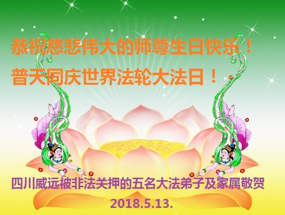 代表被非法关押在看守所的亲人同修恭祝慈悲伟大的师尊生日快乐!普天同庆、同颂5.13世界法轮大法日! 合十叩拜! 二零一八年五月八日 四川威远被非法关押的五名大法弟子及家属恭祝慈悲伟大的师尊生日快乐!