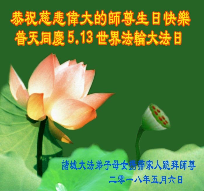 慈悲伟大的师尊您好!您把我们从地狱中捞起,用大法净化我们的心灵和身体,弟子无法表达对师尊的感恩,唯有在今后的修炼中修好自己,做好三件事,才能回报师尊的慈悲苦度之恩。 山东省潍坊市诸城市大法弟子四人学法小组恭贺513法轮大法日!恭祝师尊生日快乐!