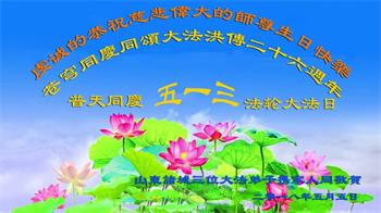 山东潍坊高密大法弟子庆祝五一三法轮大法日暨大法洪传二十六周年!祝师父生日快乐!