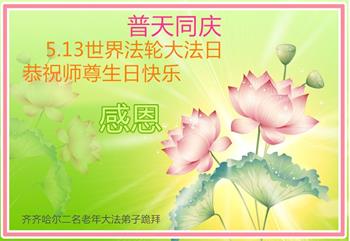 黑龙江省齐齐哈尔二名老年大法弟子恭祝师尊生日快乐!普天同庆世界法轮大法日!