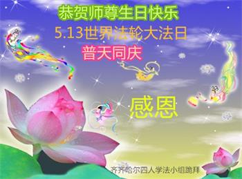 黑龙江省齐齐哈尔四人学法小组大法弟子恭祝师尊生日快乐!普天同庆世界法轮大法日!