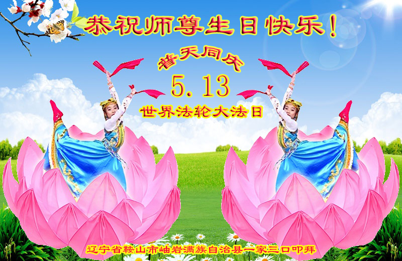 辽宁省鞍山市铁东区一家三大法弟子及全家五口恭祝师尊生日快乐!暨世界法轮大法日!