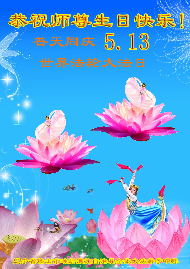 【明慧网二零一八年五月十二日】 辽宁省鞍山市岫岩满族自治县大法弟子恭祝师尊生日快乐!普天同庆法轮大法日!