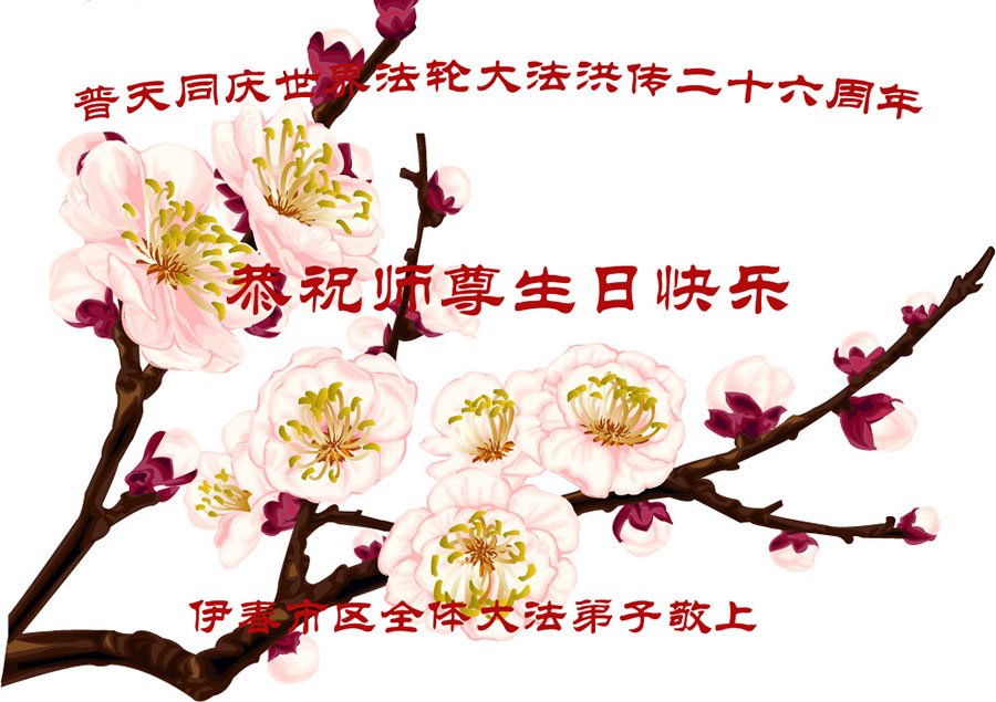 在普天同庆的法轮大法洪传二十六周年之际,我们全体大法弟子感恩师尊的慈悲苦度。在师尊正法最后阶段,我们一定更加精進,弥补以往的损失,做好三件事救度一切有缘的众生,走好最后证实大法之路跟师父回家。伊春市全体大法弟子叩拜师恩! 黑龙江省伊春市伊春区全体大法弟子恭祝慈悲伟大的师尊生日快乐!恭祝世界法轮大法日!恭祝大法洪传二十六周年!