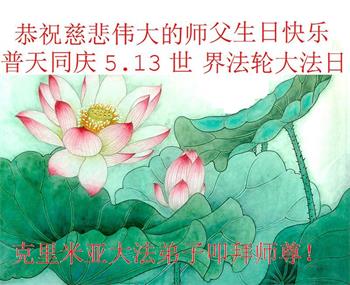 师父,您辛苦了,谢谢师父!弟子叩拜合十。 每到五一三,盼望见师面, 心中忆师恩,双眼泪涟涟。 心中惦念起,遥望长空叹, 天国家人盼,何时能团圆? 法轮大法日,普天同祝献, 回家路不远,师尊在身边! 唯有更精進,了愿再回天! 克里米亚大法弟子恭祝师尊生日快乐!