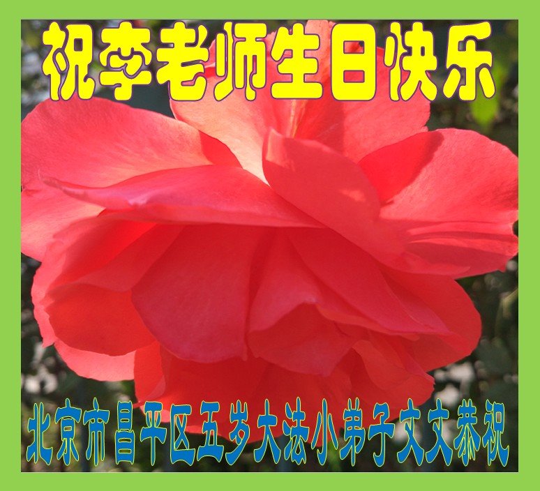 慈悲伟大的李大师:您好! 首先恭祝大师生日快乐!同庆5•13世界法轮大法日! 恭读大法书,法理铭记在心。 待人要真,行事要善,遇事要忍,人间大爱。一人学法,全家受益。再次恭祝大师生日快乐! 北京市昌平区五岁大法小弟子文文祝李老师生日快乐!