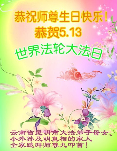【明慧网二零一八年五月十二日】 云南昆明母女、小外孙大法弟子及明真相的家人全家跪拜师尊祝师尊生日快乐!恭贺5.13世界法轮大法日!