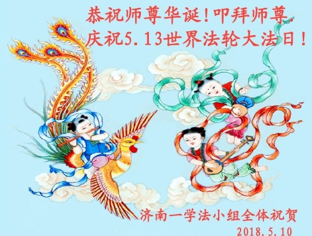师尊好!师尊辛苦啦! 在磕磕绊绊的修炼路上,我们努力做好三件事,修好心性,跟师父回家。 大法弟子 2018年5月10日 山东省济南市历下区两学法小组大法弟子恭贺师尊华诞!及世界法轮大法日!