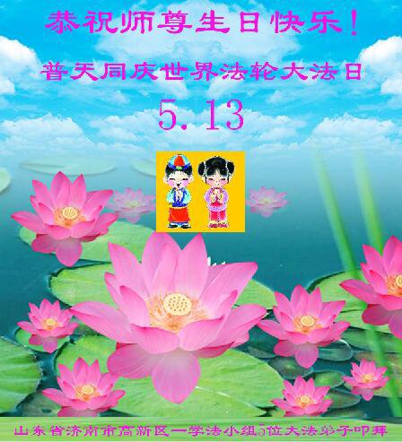 山东省济南市高新区一学法小组5位大法弟子恭贺世界法轮大法日!恭祝师尊生日快乐!