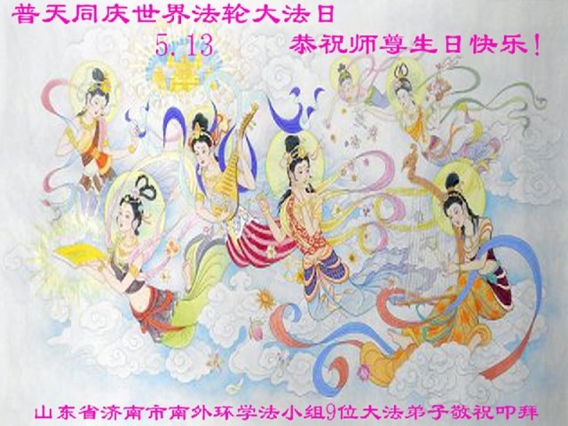 请恩师放心,我们牢记师尊的话,同化真善忍大法,做好三件事,多救众生随师还! 普天同庆 法轮大法传世间 法徒救众在人间 时刻牢记真善忍 助师正法红魔完 众生罪业恩师担 师恩浩荡苍宇间 洪微十方谢师恩 功成圆满蹬法船 山东省济南市南外环学法小组9位大法弟子恭贺世界法轮大法日!恭祝师尊生日快乐!