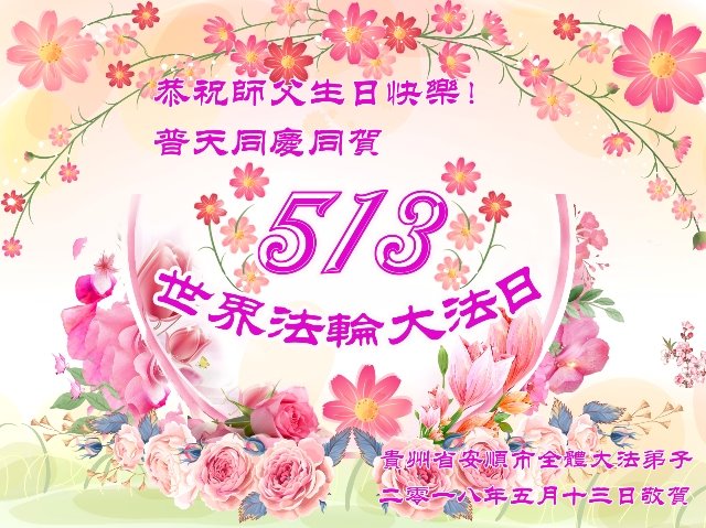 【明慧网二零一八年五月十二日】 贵州安顺市全体大法弟子恭祝师父生日快乐!贺世界法轮大法日!向慈悲伟大的师父问好!安顺全体大法弟子深深感恩师尊的慈悲苦度!