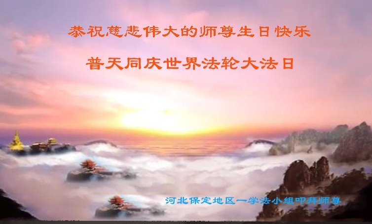 在以后的修炼路上,实修自己,更加精進多救人。请师尊放心。 河北保定地区一学法小组大法弟子恭祝师尊华诞!普天同庆世界法轮大法日!