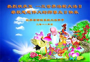 无论是在工作还是生活中,弟子们一定按大法的要求做好人,做更好的人,我们也是法轮大法的亲身受益者,修炼大法使人身心健康!感恩师尊救度之恩!我们一定听师父话,做好三件事,让更多的中国民众了解大法真相,在中国大陆早日可以自由修炼法轮大法这部高德大法! 江苏省财税系统全体大法弟子恭祝慈悲伟大的师尊生日快乐!