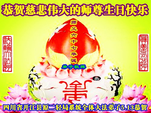 四川省达州市开江县原二轻局系统全体大法弟子恭祝慈悲伟大的师尊生日快乐!