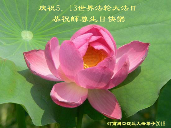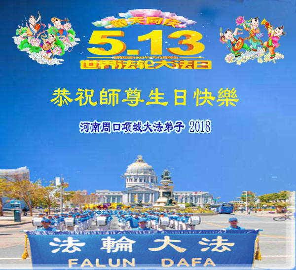 师尊好:弟子们想念您,您辛苦了! 弟子在不断的学法中,在每一次遇到的心性过关中和魔难考验中,弟子深深体会师父就在身边,时刻都在看护弟子,没有师父的悄然而护,是没法修炼的,只有在多学法,学好法中,坚定的信师信法,多救人已报师恩。 2018年5月10日 河南周口项城大法弟子庆祝5.13世界法轮大法日!恭祝师尊六十七岁华诞!