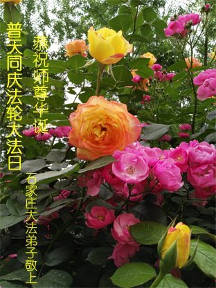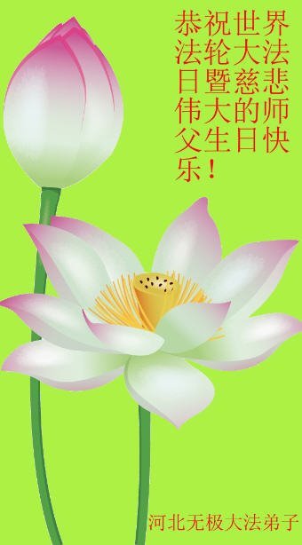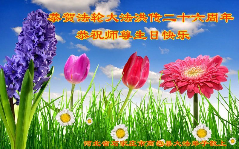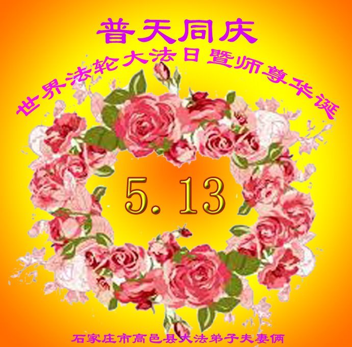 我们石家庄市全体大法弟子恭祝师尊生日快乐!暨法轮大法日!在这普天同庆的光辉日子里,我们想起了慈悲伟大的师尊为大法弟子们的做作的一切,为大法弟子们所承受的一切,我们唯有做好师尊要我们做好的三件事,多学法,多去人心、快去人心,多救人、快救人来报答师尊的无比洪大恩泽! 河北省石家庄市正定县正定镇大法弟子恭贺5.13世界法轮大法日!恭祝师父生日快乐!