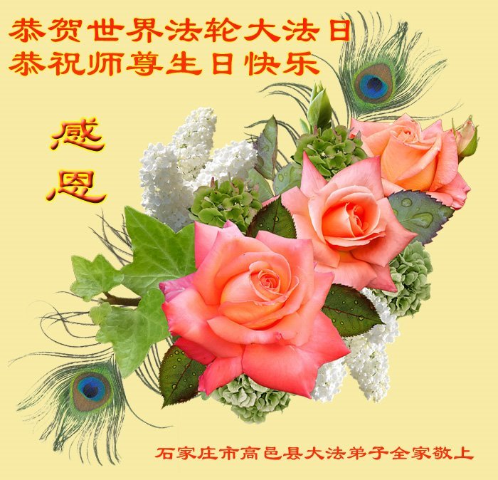 河北省石家庄大法弟子代表父母和两位妹妹五位大法弟子恭祝师父寿诞恭贺法轮大法日!