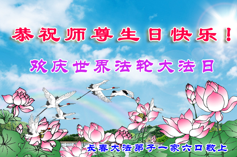 吉林省长春大法弟子一家六口恭祝师尊生日快乐!祝贺5.13世界法轮大法日!