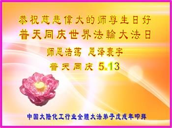 | 【明慧网二零一八年五月十二日】法轮大法是佛法修炼,开传于常人社会,各行各业不同工,却有着共同的信仰,生活中实修升华,工作中体现出心性。二十六年来,大法中修炼的弟子越来越体悟到法轮大法的博大和精深。在恩师六十七岁华诞和世界法轮大法日庆典的时刻,来自数十行业的大法弟子用贺词、表达他们对恩师的感谢。 下面的贺词、有来自医务界、教育、科技、交通、财务审计、航空航天、金融、银行、铁路、公交、建材工业、供销、水利、纺织、邮电、农牧、卫生医疗、石油、药材、钢铁、林业、农垦、服务行业、电力、水利商业、房地产、环卫、飞机制造、保险、外贸、军工、国土、燃气、餐饮、疾病预防控制系统等行业的大法弟子。 中国大陆化工行业全体大法弟子恭祝师尊生日好!