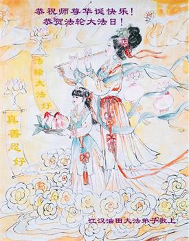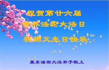弟子千言万语难以表达对师父的敬意与感恩!师父!尊敬的师父!弟子唯有精進实修,做好三件事,圆满随师还。 冀东油田全体大法弟子祝贺第廿六届世界法轮大法日!祝师父生日快乐!