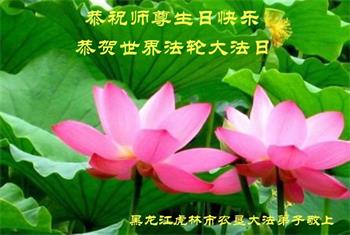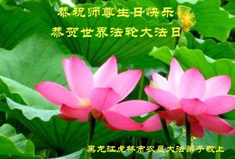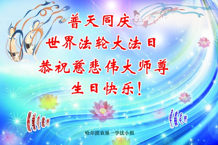 恭祝法轮大法洪传世界十九周年!恭祝师尊生日快乐! 师尊辛苦了!弟子用尽人间的语言也无法表达对师尊的感谢之心!唯有精進实修!努力的做好三件事!唯以回报师尊! 哈尔滨农垦一学法小组大法弟子恭祝慈悲伟大师尊生日快乐!