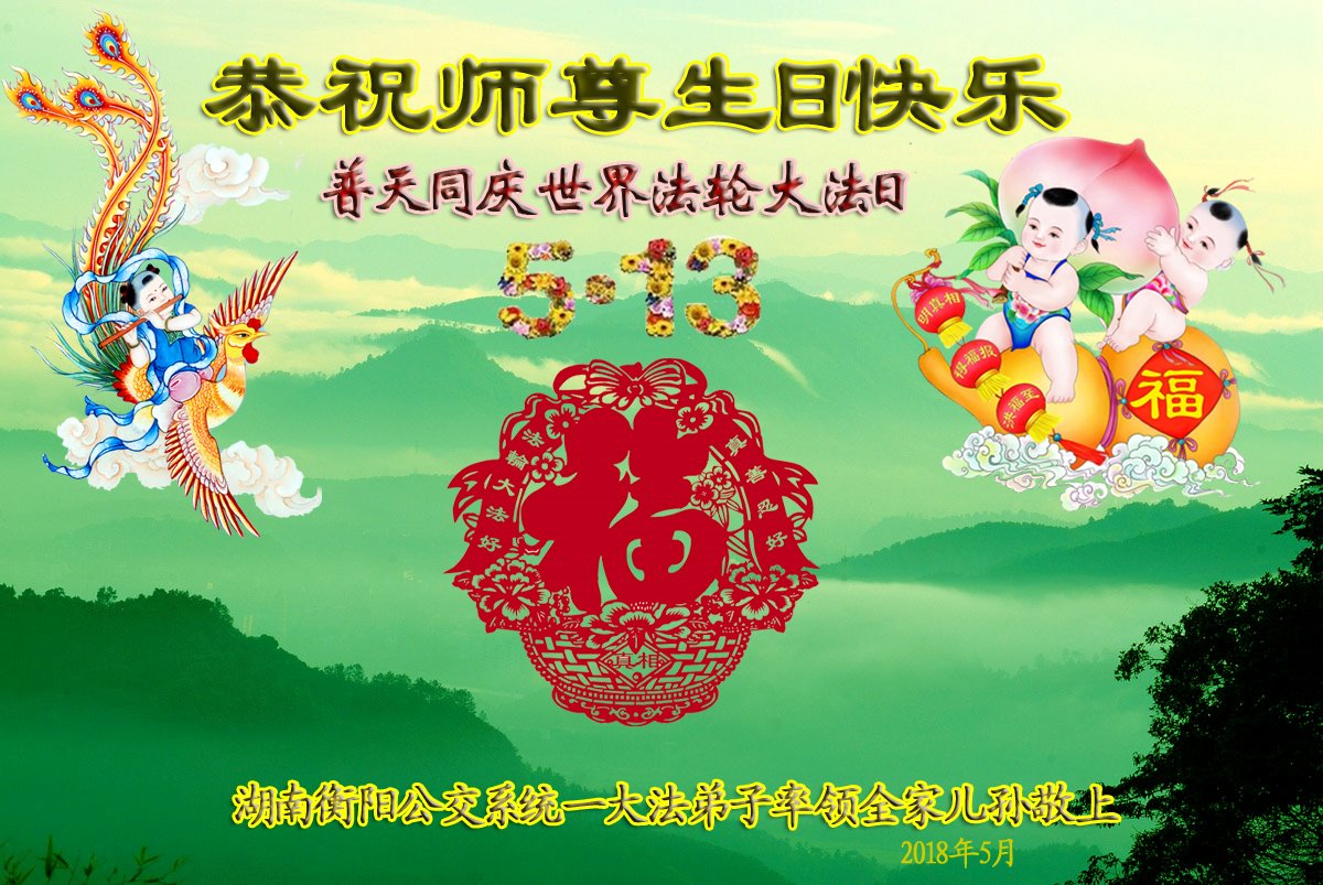 湖南衡阳公交系统一老年大法弟子率领儿孙全家恭祝师尊生日快乐!普天同庆世界法轮大法日! 2018年5月敬上 湖南铁路系统一夫妻大法弟子恭祝师尊生日快乐!
