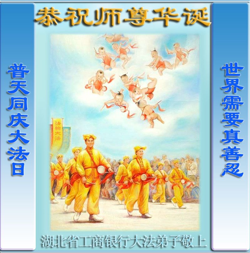 法轮大法好! 真、善、忍,好! 创世主大慈大悲, 传大法救度众生。 千百轮回在期盼, 万古一事今朝现。 大法徒尊师教誨, 正法路上急救人。 横扫邪灵千魔灭, 世人惊醒红潮敗。 佛光普照天地间, 三亿民众得新生。 普天同庆大法日, 迎接宇宙新纪元。 尊师华诞千叩首, 再谢师恩法无边。 众生感恩齐欢跃, 祝恩师生日快乐! 佳木斯大法弟子叩拜 二零一八年四月二十八日 湖北省工商银行大法弟子恭祝慈悲伟大的师尊华诞!恭贺世界法轮大法日!