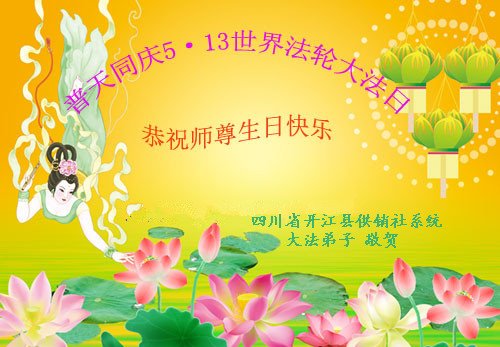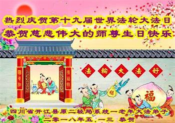 四川省开江县原二轻局系统一老年大法弟子热烈庆贺第十九届世界法轮大法日!