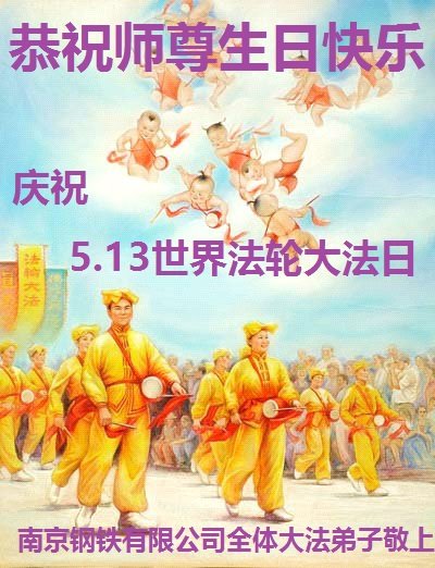 师尊您辛苦了! 江苏南京钢铁联合有限公司全体大法弟子恭贺师尊生日快乐!暨世界法轮大法日!