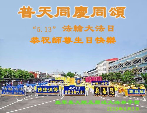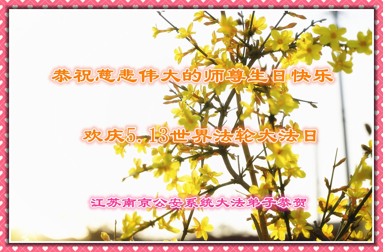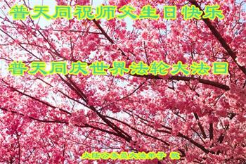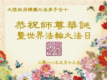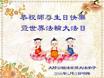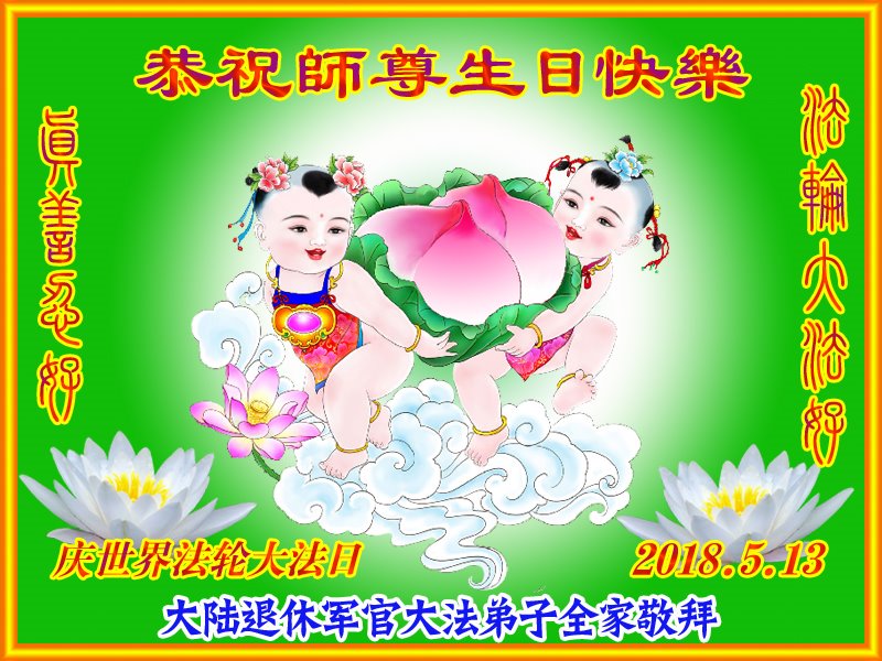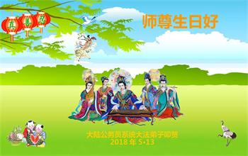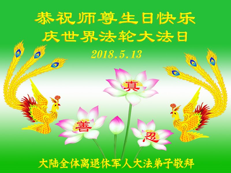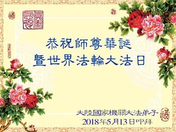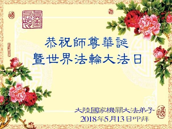 | 【明慧网二零一八年五月十二日】(明慧网记者综合报道)在绿柳成荫、繁花似锦的日子,迎来了慈悲伟大的师父的华诞与“五·一三”世界法轮大法日这个盛典,中国大陆公检法系统、各级政府部门及军中现役、转业的大法弟子与世界各地的弟子们一起,恭祝师父生日快乐!向师父表达无限感恩! 大陆一名公务员大法弟子说:谢谢师父把我变成了一个道德高尚的好人,做一个清清白白的公务员!望世人明白真相,看清善恶正邪,做出一个清醒、理智、正确的选择! 北京地区军委直属机关,部份离退休、复转干部写道: 五月春风荡邪灵,三件事中修心性。 师尊华诞普天庆,正念正行心自明。 邪恶狂舞何所惧,信师信法显神通。 回归路途曙光现,新天新地宇宙清。 原南京军区的大法弟子的诗中说: “5·13” 普天同庆 颂师恩 千言万语难尽 精心铺垫亘古前 层层下走结法缘 传法 师父您历尽艰难辛酸 正法 师父您承受着一切再推延 世人 要抓住千载难逢机缘明真相,劫难来临保平安 法徒 要珍惜千金万金时间更精進,誓约兑现随师还 大陆国家机关大法弟子恭祝师尊华诞暨世界法轮大法日!