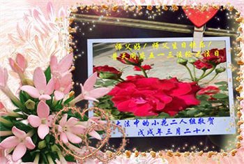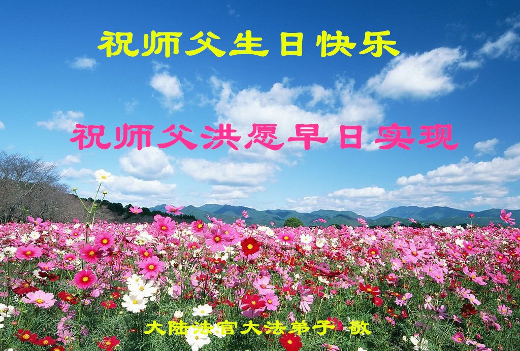“世界法轮大法日”到了,我们怀着感恩的心情恭祝师尊生日快乐!一路走来,没有师尊的保护无法走到今天。我一定要珍惜这不多的时间修去人心多救人,惟愿师尊笑! 大陆一名公务员大法弟子恭祝师尊生日快乐!
