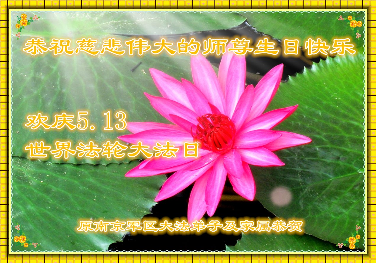 大陆原南京军区大法弟子及家属恭祝 师恩颂 “5·13” 普天同庆 颂师恩 千言万语难尽 精心铺垫亘古前 层层下走结法缘 传法 师父您历尽艰难辛酸 正法 师父您承受着一切再推延 世人 要抓住千载难逢机缘明真相,劫难来临保平安 法徒 要珍惜千金万金时间更精進,誓约兑现随师还 大陆原南京军区大法弟子及家属恭祝伟大的师尊生日快乐!欢庆世界大法日!