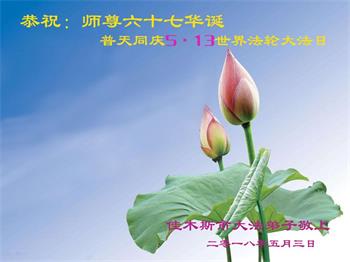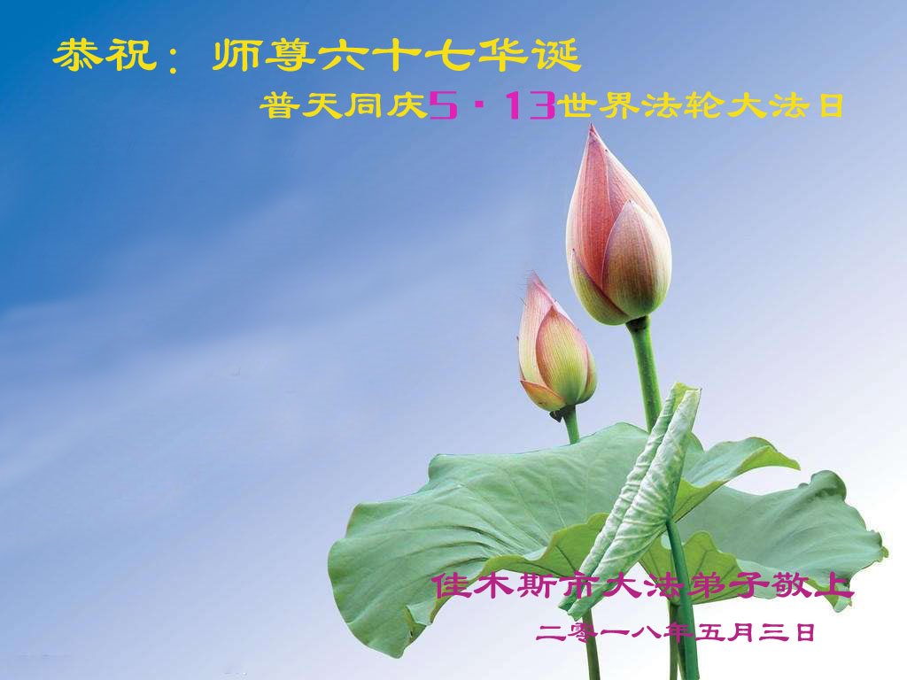 五一三 朵朵莲花开。 师华诞 祝师永愉快。 大法日 救人除阴霾。 大法徒 精進大步迈。 救众生 三:退.有未来。 人和神 叩首师关怀。 佳木斯大法弟子 2018.5.13。 黑龙江省佳木斯地区大法弟子喜庆5.13!感恩伟大的师尊!