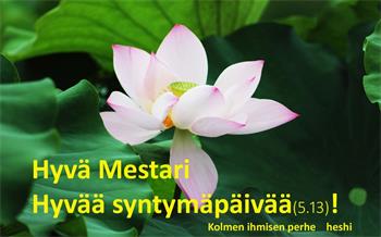 感恩师尊 师恩浩荡掌法船 洪微归正挽狂澜 佛光普照真善忍 普天同庆五一三 芬兰大法弟子一家三口恭祝师父生日快乐!