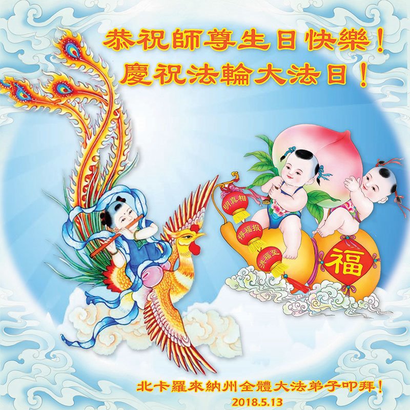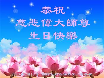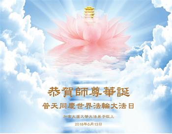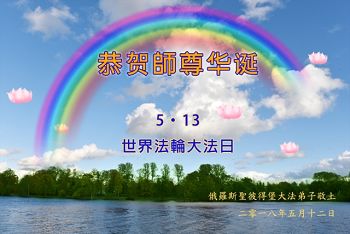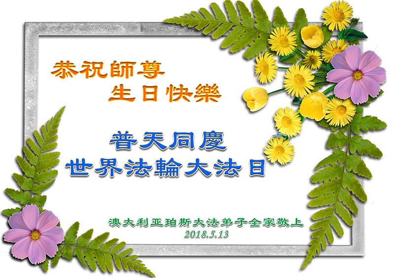 | 【明慧网二零一八年五月十三日】(明慧网记者综合报道)五月十三日,是感恩的日子。一九九二年的五月十三日,法轮大法创始人李洪志先生开始向全社会公开传授大法。今天,一百多个国家和地区的民众已在修炼能使人修心重德、返本归真的法轮大法,五月十三日,也是师尊华诞,成为世界法轮大法日。 在这个特殊的日子里,天上人间,普天同庆,海外的法轮大法弟子给师父发来贺词,恭祝师父六十七岁华诞,恭贺师父传法二十六周年,同贺世界法轮大法日! 日本大法弟子在贺词中说:“我们是随师父下三界的古老生命,在生生世世的轮回辗转中没有忘记自己的初心,如今接上圣缘,弟子知道珍惜!不论还有多少个寒来暑往,我们一定会勇猛精進。” 韩国济州岛大法弟子写道:“同修在交流文章中常提到;师父给了第二次生命。我的感受是师父不但给了我第二次生命,还给了我第三次、还有更多次……” 塞浦路斯大法弟子写道:天上人间众神贺,得救众生得福乐。大穹即将崩溃前,主佛慈悲到人间。 我们收到了来自美国各州、加拿大、墨西哥、澳大利亚、俄罗斯、丹麦、意大利、奥地利、西班牙、爱尔兰、罗马尼亚、芬兰、德国、英国、瑞典、日本、越南、韩国、朝鲜、塞浦路斯、塞尔维亚和黑山、希腊、匈牙利、保加利亚、克罗地亚、拉脱维亚、伊朗、巴西、泰国、印尼、缅甸、马来西亚、新加坡、台湾、香港、澳门、沙特阿拉伯、摩尔多瓦、比利时、挪威、法国、瑞士、阿联酋、捷克、斯洛伐克、波兰、荷兰、波黑、新西兰、土耳其、克里米亚、菲律宾等五十多个国家和地区的大法弟子的贺信。下面是其中的部份贺信贺卡。 旧金山湾区全体大法弟子恭贺师尊华诞!齐贺法轮大法洪传世间26周年!暨第十九届世界法轮大法日!