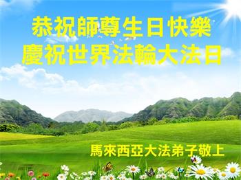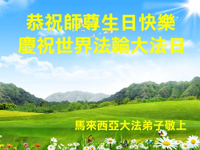 5月13日-----世界法轮大法日!在这普天同庆的美好时刻,全球电话组DHT平台紧急接力组全体大法弟子恭祝慈悲伟大的师尊:生日快乐! 师父啊,您将亿万弟子从地狱中捞起,又将“正法时期大法弟子”的神圣称号赋予了我们,为拯救大穹您为众生承受了无量巨业,您为众生操尽了心!此时此刻即使用尽人类的语言也难以表达弟子们对您的感恩之心。佛恩浩荡,师恩难报。弟子们一定不辜负您的教诲,精進实修多救人,兑现誓约登法船。 跪谢师尊救度洪恩! 马来西亚大法弟子恭祝师尊生日快乐!
