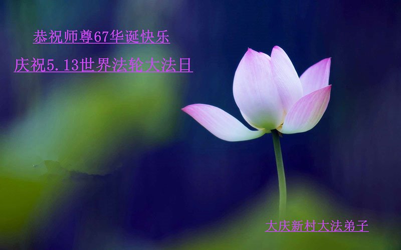 五月十三日,是恩师华诞,又是大法洪传二十六周年纪念日,天国云间,三界人间,共同高歌!师父好!法轮大法好!真善忍好!感谢恩师的慈悲救度! 跪拜恩师!合十! 长春大法弟子 2018年5月9日 普天同庆 普天同庆佛光照, 师尊看护层层宇。 救度无量佛道神, 力挽大穹止坏灭。 魔鬼布阵毁众生, 黑手乱鬼全出动。 天黑地黑人也黑, 重重魔难重重关。 佛主挥手妖魔灭, 旧势黑手全扫除。 师恩浩荡普新篇, 法光照耀天地间。 跪拜恩师 合十 长春大法弟子 2018年5月9日 四川省成都市全体大法弟子和家人恭祝五·一三大法日!恭祝师父生日快乐!