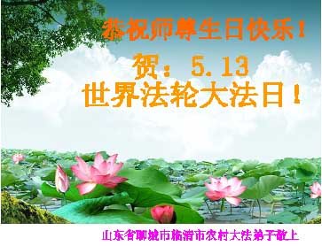 我们一定要多学法,理解好法,走正师尊安排的助师正法之路,抵制各种干扰,做好三件事,多救人,决不辜负慈悲伟大的师尊的苦心救度与厚望!谢谢师尊!弟子跪拜师尊! 辽宁省鞍山、辽阳周边农村大法弟子恭贺5.13!恭祝师尊华诞!