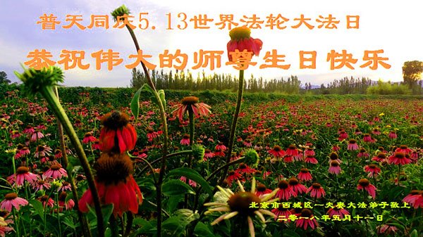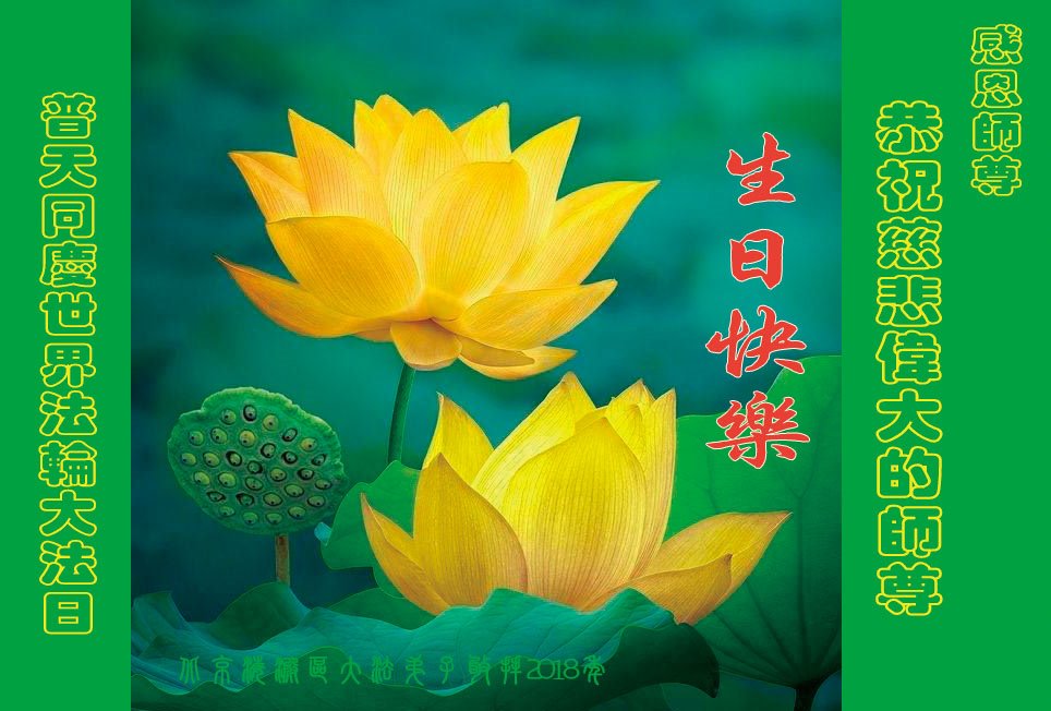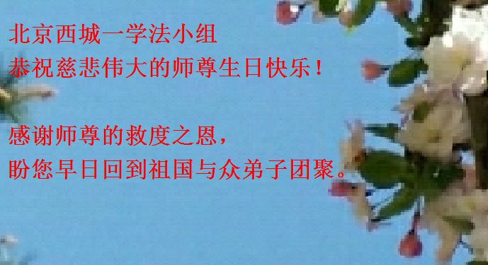 我们两个是最近几年从新走回来的大法弟子,感恩师尊的慈悲救度!我们按照师尊的要求,很想努力做好三件事,但是感觉时间紧迫,落下的太多了,尤其是在讲清真相方面,和一直坚持修炼的同修比起来,相差太远了。可是一想到师尊给予我们的太多太多,我们还是很有决心的。我们从开始不敢讲,到后来的开口讲。我们讲真相时,一个人讲,一个人在旁边发正念。我们有一次遇到一个做瓷器生意的年轻老板,他是信基督教的,同修A先给他讲了“天安门自焚”伪案,又对他讲到“共产党讲无神论,如果不退出党、团、队,神都不会管的,因为共产党是西来幽灵,入了他的组织就被打上了烙印,因为你加入他的组织时,都发誓为共产主义奋斗终生。这样一来,共产邪灵就控制了人的生命。只有退出党、团、队,才能抹去兽印,真正得救。不然的话,天灭中共时你也会跟它一起淘汰。这是一件多么可怕的事啊。”那个老板听明白了真相,马上给自己起了一个化名退出了入过的团、队组织。一个生命得救了,我们真为他高兴。我们在以后的宝贵时间里,还要一如既往的去救人,努力做好三件事,早日跟师尊回家。在此,我们要再一次感恩师尊的慈悲救度!感谢师尊为我们安排的修炼环境,在我们刚刚走回来时,安排同修大姐和我们一起学法,一起切磋,给我们送来师尊的新经文和真相资料。我们也劝那些还没有走回来、走出来的同修赶紧走回来、走出来。回到大法中来。这也是我们的愿望。 北京西城一学法小组恭祝师尊生日快乐!