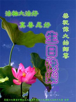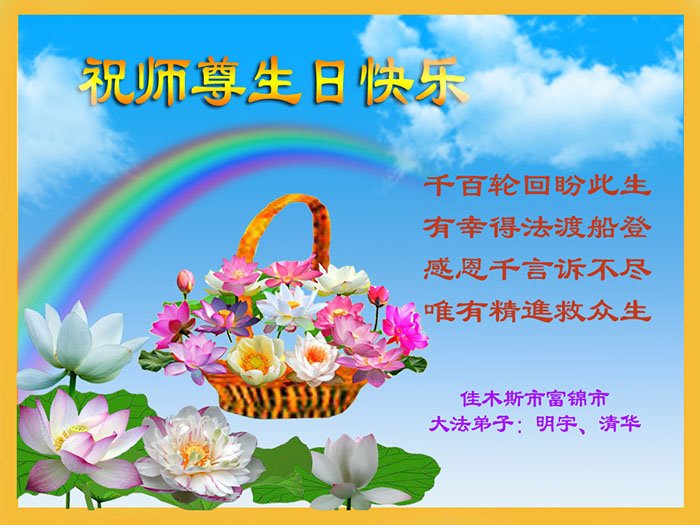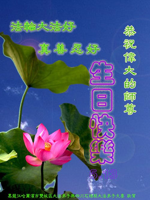 修炼大法身心健 七八十岁现童颜 遇到矛盾找自己 互相关心添正念 天天做好三件事 都愿师尊喜开颜 祝愿师尊生日好 兑现誓约登法船 黑龙江省哈尔滨大法弟子恭祝慈悲伟大的师尊生日快乐!