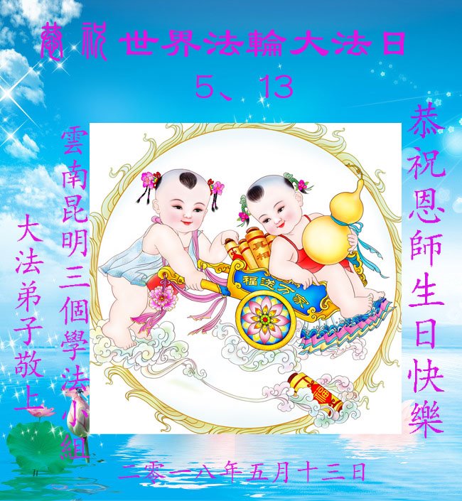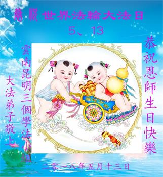 千百轮回盼此生 有幸得法渡船登 感恩千言诉不尽 唯有精進救众生 云南昆明大法弟子庆祝世界法轮大法日!