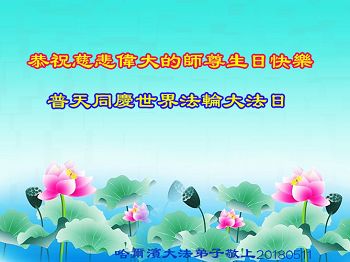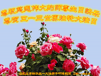 又到一年的法轮大法日!我们一家三口人从1997年得法到今日,已经将近21年,在这21年的风风雨雨中,老师一直在呵护着我们和我们的环境,我们的人生因为有了大法而光明与幸福。在这里感谢师尊、感谢大法!弟子要摈弃人的安逸执着,再次坚定信念,走好最后的修炼之路。老师一直在给我们机会,真的不能到时后悔晚矣呀! 辽宁省阜新县大法弟子祝师尊生日快乐!
