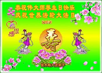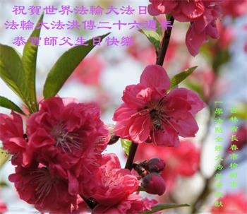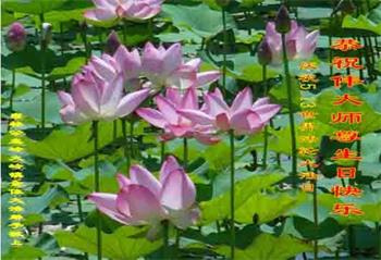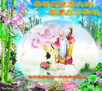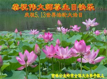 师尊华诞宇宙欢, 全球恭贺五一三。 弟子叩首拜师尊, 生日快乐!寿无限! 亿万弟子沐佛恩, 精進三事永向前。 救度众生心慈善, 他日法正随师还。 黑龙江省佳木斯大法弟子恭祝伟大的师尊生日快乐!祝贺世界法轮大法日!