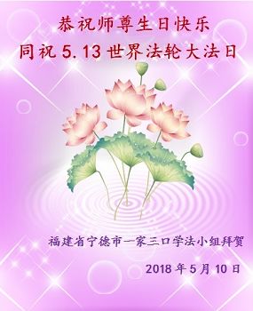 我们在师父的呵护下走过了二十多个年头,身心受益,我们决心在最后的时间里走好师父安排的路,整体配合,提高心性,扎扎实实的修好自己,多救度众生,感谢恩师! 福建省宁德市一家三口学法小组恭祝师尊生日快乐暨世界法轮大法日!