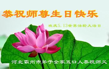 谢谢师尊慈悲苦度!弟子坚修大法到底。 河北廊坊霸州市大法弟子一家五口人恭祝伟大的师尊生日快乐!欢庆世界法轮大法日的到来!