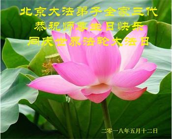 在这正法最后的时刻,弟子们一定在实修中与同修配合好,多学法、向内找,完成好救人的使命。叩谢师父! 北京大法弟子全家三代恭祝师尊生日快乐!同庆世界法轮大法日!